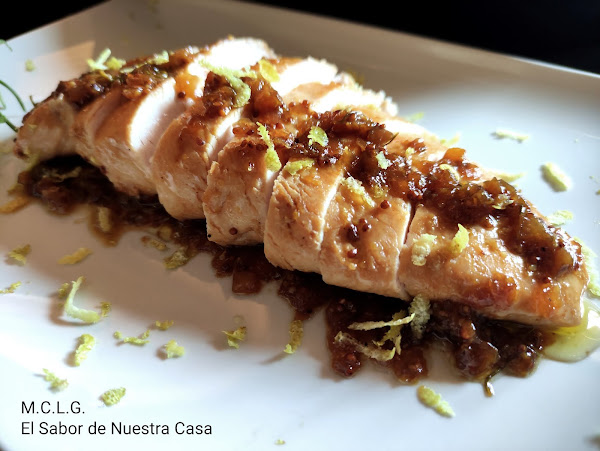 Cocina durante unos diez minutos, según el grosor de los solomillos, hasta que la marinada se absorba y quede el glaseado. Sirve con la salsa y esparce las ralladuras de limón.
