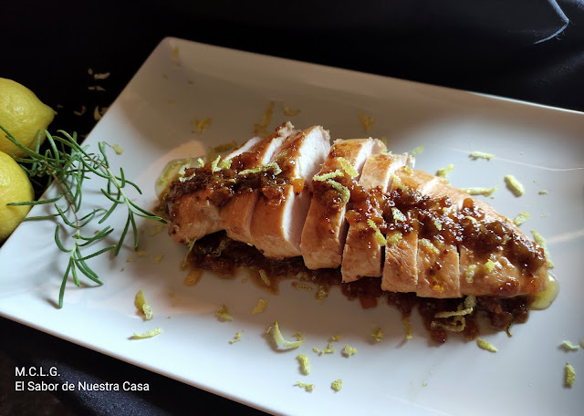 En un bol el zumo de limón, la piel del limón, la salsa de soja, la mostaza antigua, el azúcar, el romero fresco, pimienta negra recién molida, sal y unas cucharadas de aceite de oliva virgen extra. emulsiona con un tenedor y reserva esta marinada.