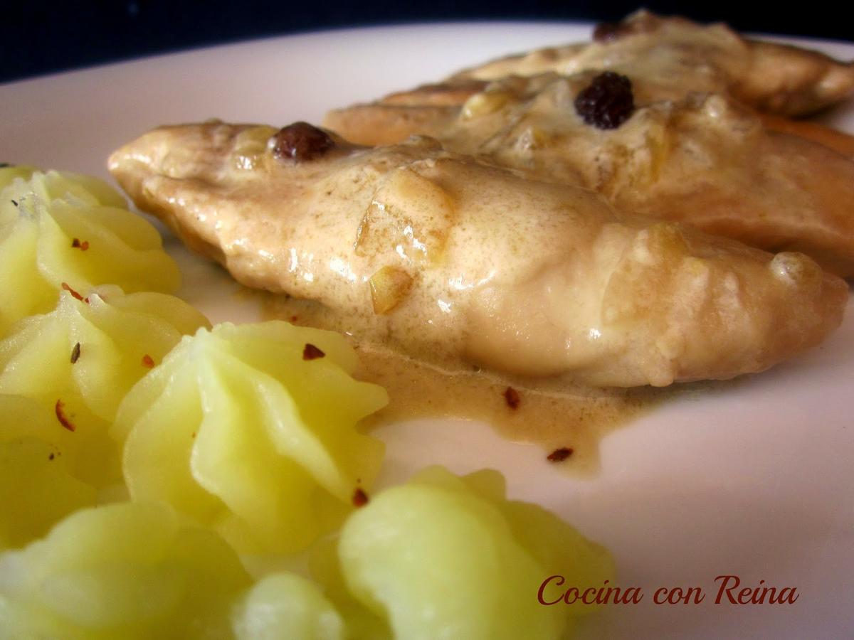 Añadimos la nata (crema de leche), las pasas y los piñones y añadimos los solomillos reservados.