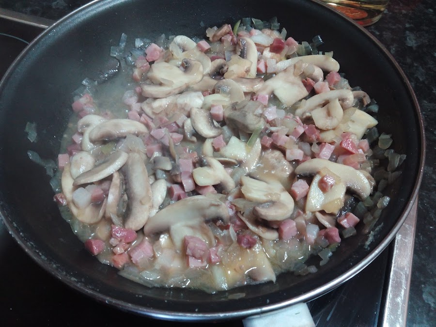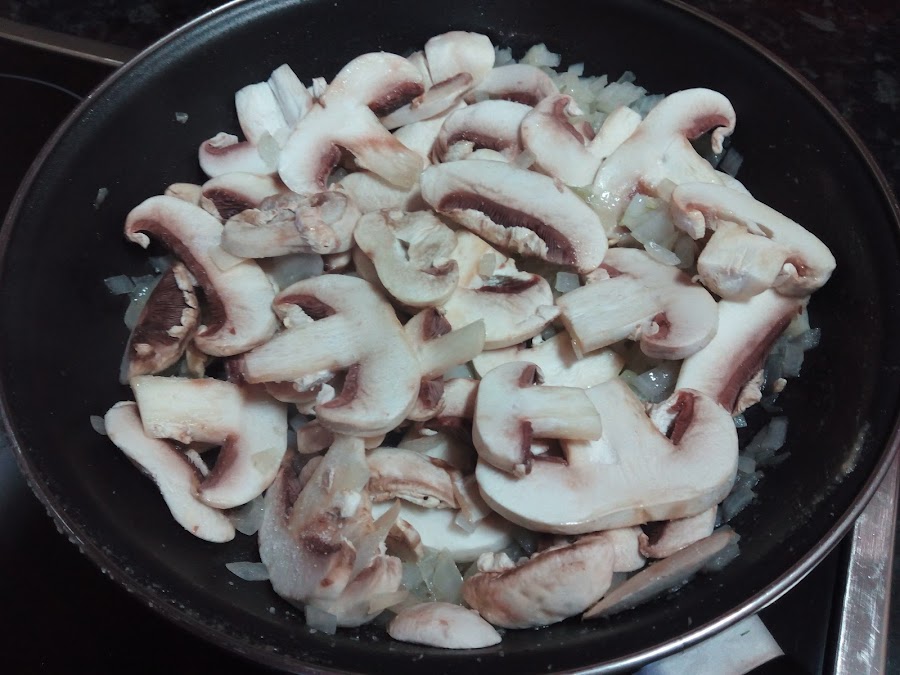 Cocinamos hasta que reduzca el agua que sueltan los champiñones.