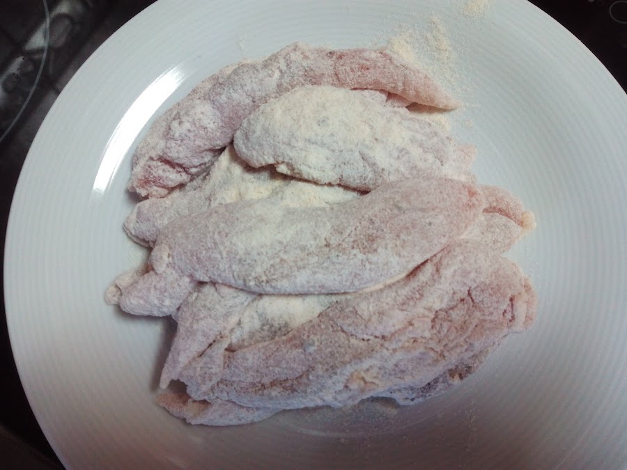 Salpimentamos el pollo y lo pasamos por harina.