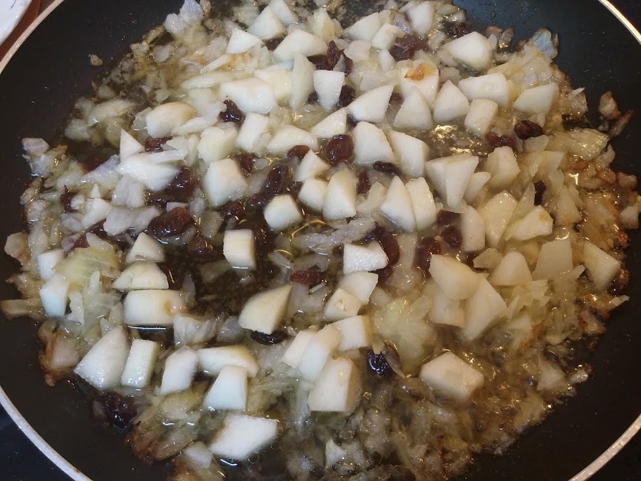 Cuando empiece a dorarse añadimos un puñado de pasas y las peras cortadas a dados. También 75 ml. de brandy. Dejamos unos 10 minutos. Reservamos el sofrito.