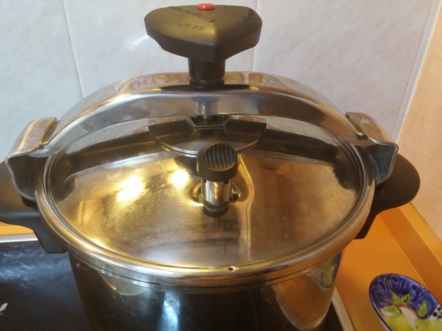 Cerramos la olla, subimos el fuego y cuando la válvula comience a dar vueltas, bajamos el fuego y dejamos cocer unos 20 minutos.