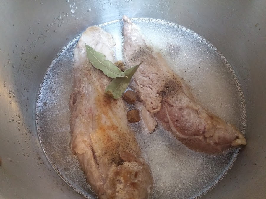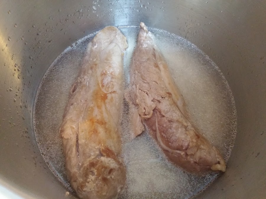 En la olla expréss, ponemos los solomillos y salpimentamos. Añadimos agua, sin que cubra del todo los solomillos.