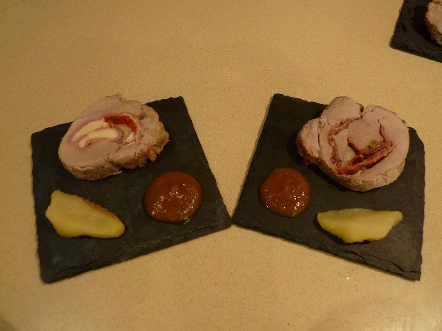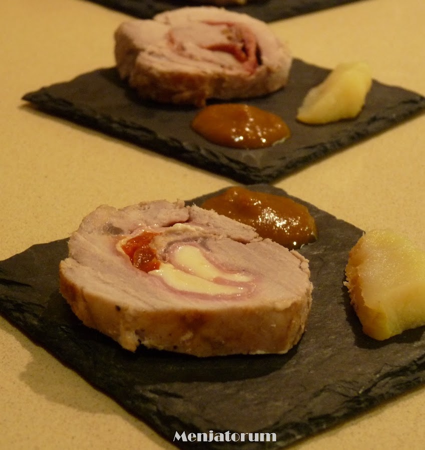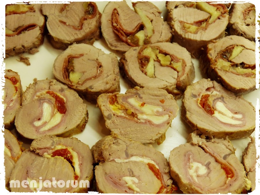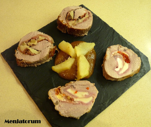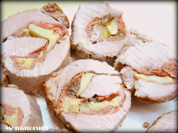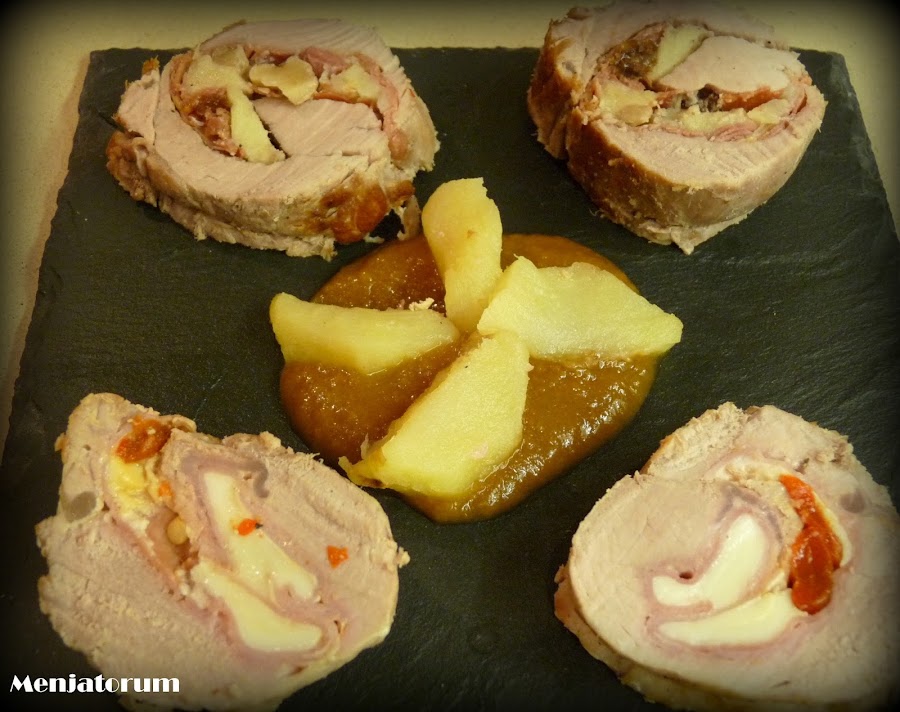 Extender el solomillo sobre una superficie plana, salpimentar, extender sobre él unas lonchas de jamón serrano , encima unas nueces troceadas, gajos de manzana y pasas.