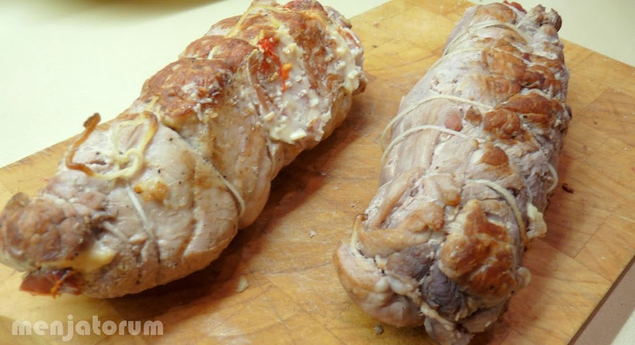 Enrollar bien apretado y atar con hilo bramante, anudar el hilo a un extremo para sujetar, a continuación hacer lazadas que rodeen la carne primero a lo ancho y después con un hilo central a lo largo,hasta dar la vuelta.apretar bien con un nudo para sujetar la pieza.