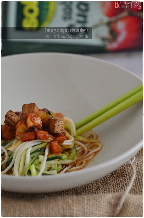 Realizamos los espaguetis de calabacín que pasamos por la plancha a fuego fuerte unos 2 minutos para que se cocinen ligeramente. Emplatamos, poniendo en la base del plato la mezcla de calabacín con fideos somen y por encima las verduras con tomate y un poco de la salsa que han dejado.