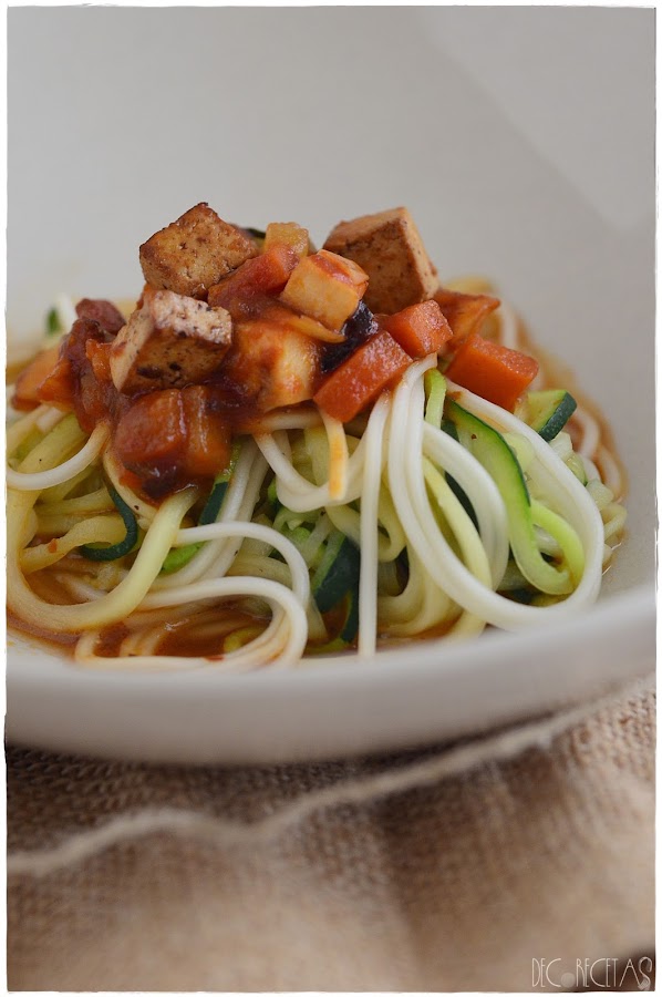 Para realizar esta receta, poché media cebolla, junto con dos zanahorias picadas. Cuando estaban blanditas, agregue cuatro champiñones grandes y un cuarto de calabacín en taquitos pequeños, que cociné a fuego bajo agregando 100 mililitros de tomate frito. Por otra parte, corte en cubitos 100gr de tofu, que sumergí en salsa de soja media hora antes de dorarlos a la sartén a fuego fuerte para mezclarlos con las verduras cuando ya estaban cocinadas.