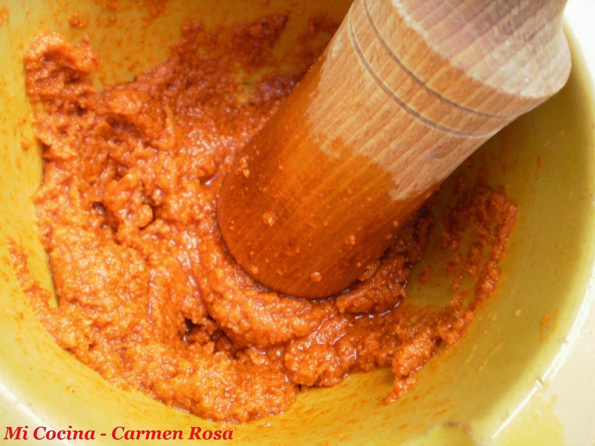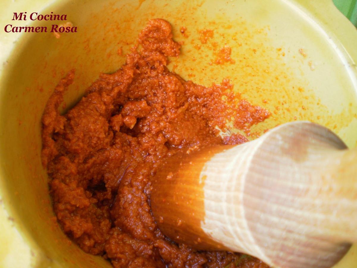 Agregar la miga de pan remojada con el vinagre e ir labrándo todos los ingredientes con aceite, echándolo poco a poco hasta obtener una masa homogénea muy fina.