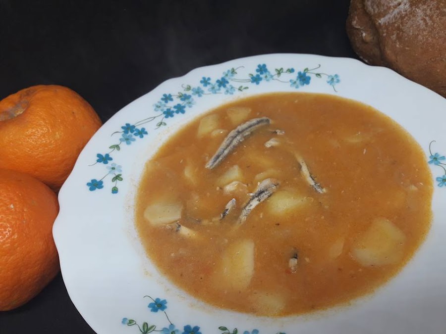 Casi al final añade tiras de bacalao desalado, o unos boqueroncitos limpios sin tripas ni cabeza, y deja cocer si son boquerones 2 minutos, y si es balacao unos 5 minutos.