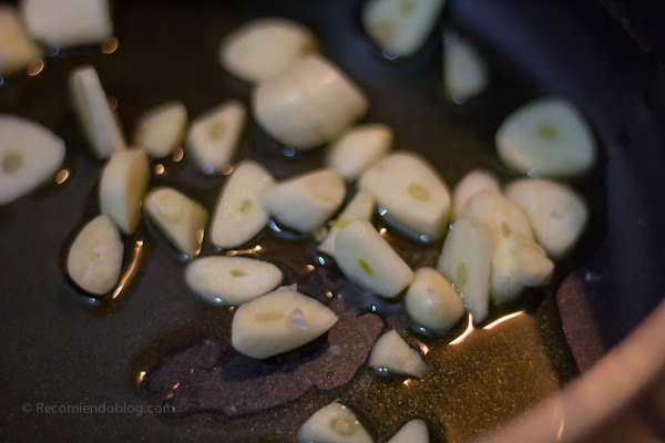 En una olla o cacerola, agregar aceite de oliva y los ajos pelados y picados en cortes no muy pequeños. Sofreír unos segundos, en fuego medio, hasta que el aceite se impregne del sabor. Retirar los ajos y reservar.