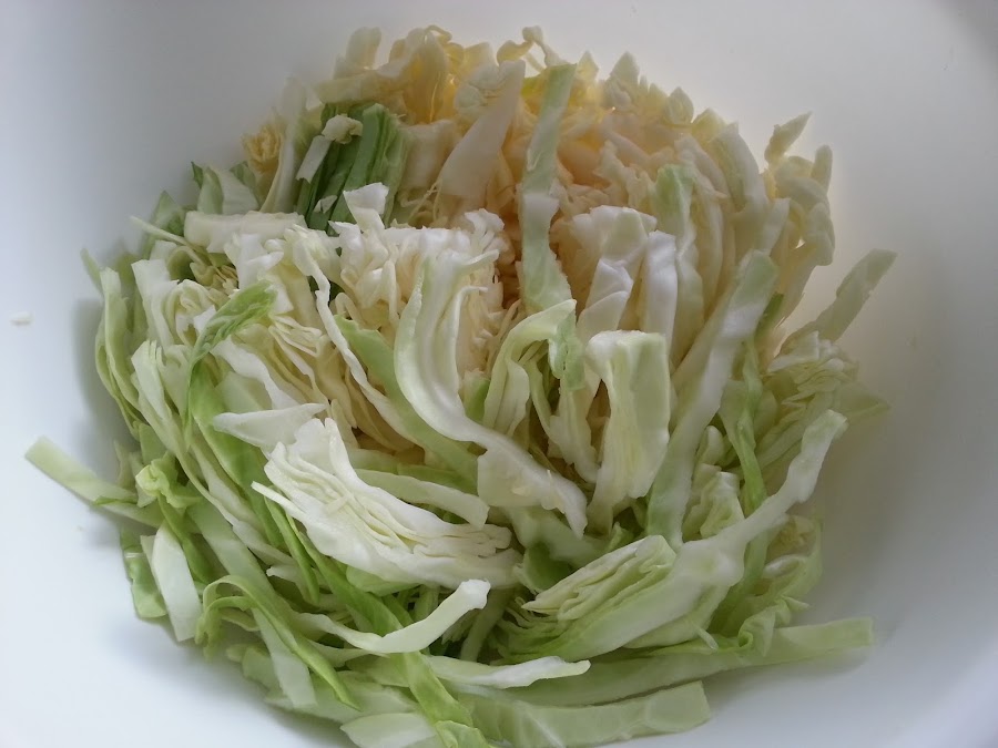 2. - Mientras se calienta, cortamos la col en finas tiras.