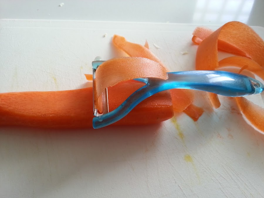 4. - Pelamos mientras la zanahoria y la cortamos en finas tiras, yo con el pela patatas la hice en láminas, pero podéis ponerla en juliana fina.