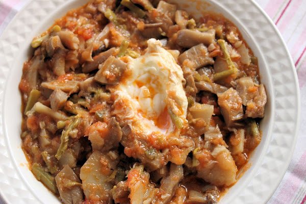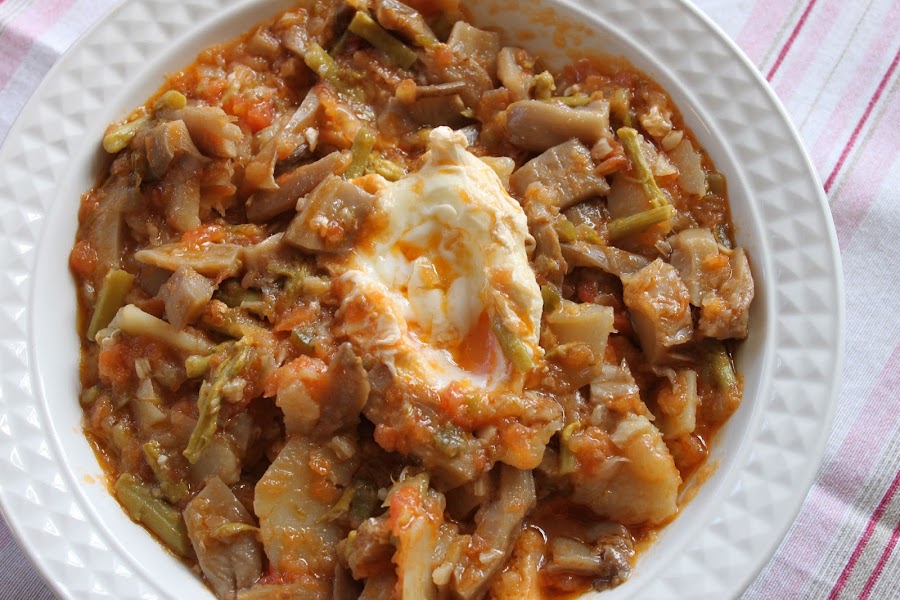 Hacemos un sofrito con los ajos, cebolla y pimiento; añadimos las setas troceadas los espárragos partidos y la copa de vino "Grande de Apiane" (yo le eché también una patata pequeña cortada en cascos pequeños) y seguimos cocinándolo un par de minutos. Echar el tomate, sazonar y dejar otro par de minutos removiendo de vez en cuando. Agregar agua, que cubra bastante por encima del sofrito y dejar hervir unos 15´ más o menos a fuego medio alto, o hasta que la patata esté blanda.