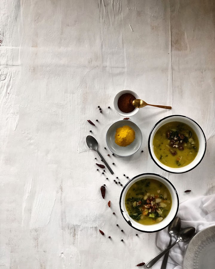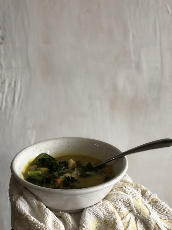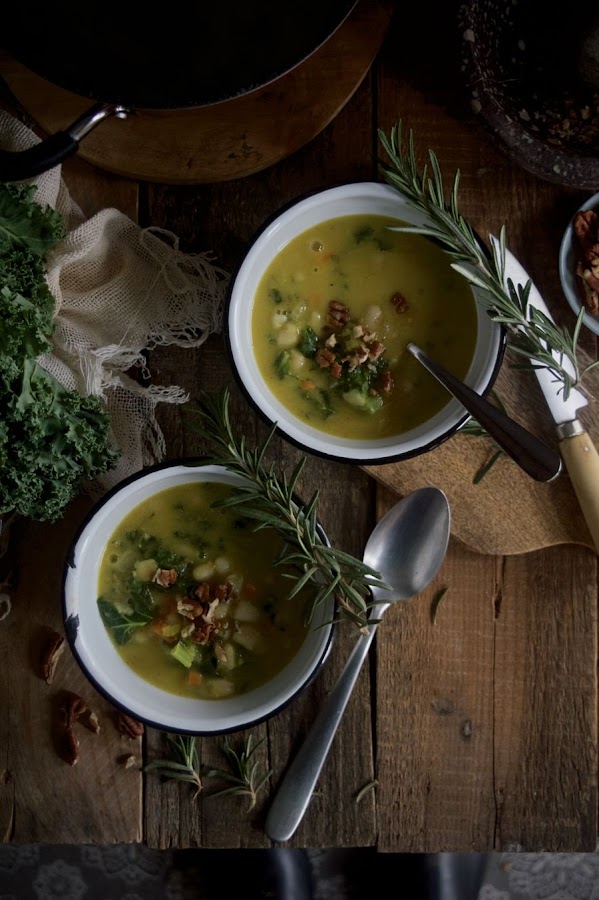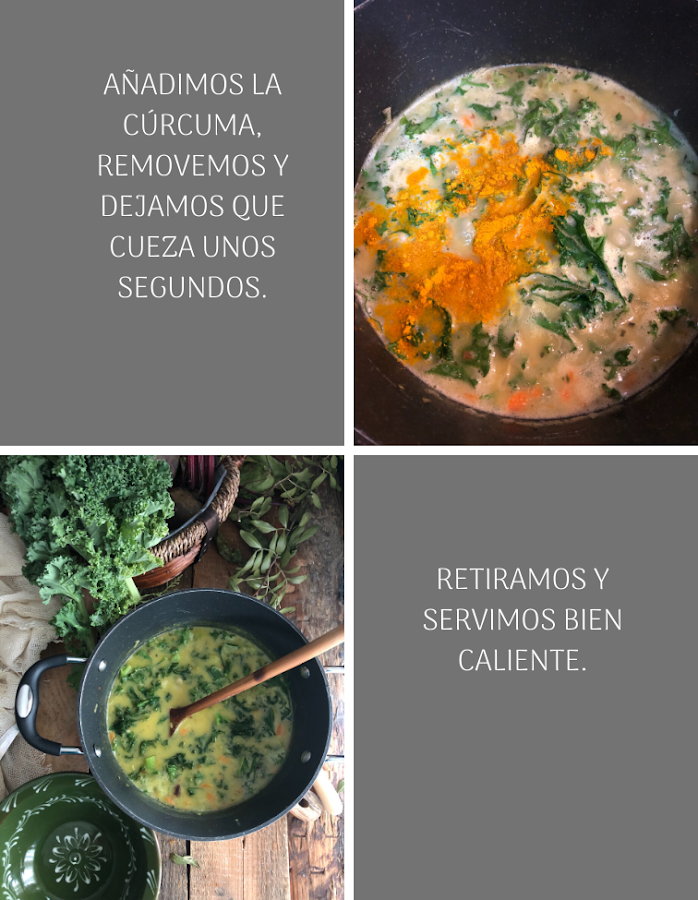Si no, dímelo a mí que hace unas semanas estaba fatal. Mi hijo pequeño se enfermó y todos fuimos cayendo poco a poco. Afortunadamente somos duros y en dos días se nos quitó todo. Pero en la clase de mi hijo pequeño llegaron a faltar 15 niños. ¡Vamos, pienso yo, que el profesor creería que estaba en el paraíso! Por entonces, solo tomaba mi sopa de pollo antigripal, pero ahora con esta sopa de alubias blancas con kale y romero que lleva un poco de cúrcuma, que vengan virus a mí, ¡jeje!