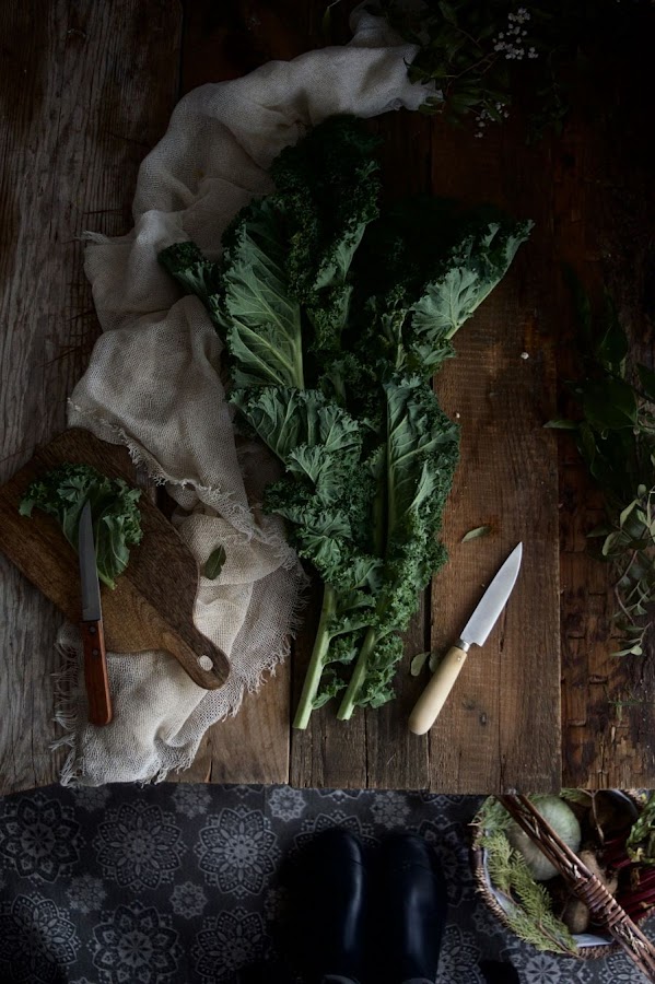 A veces cuando me pongo a fotografiar, me transporto a otros lugares, imagino que estoy en una casa de campo, que he venido del huerto y me he traído estas estupendas kales con otros productos de la huerta. Todo ecológico, muy rústico, sano y natural. ¿Te pasa a ti lo mismo?
