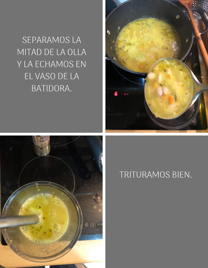 Cuando dé el primer hervor, cogemos la mitad de la sopa y la trituramos en la batidora. La devolvemos a la olla y removemos.