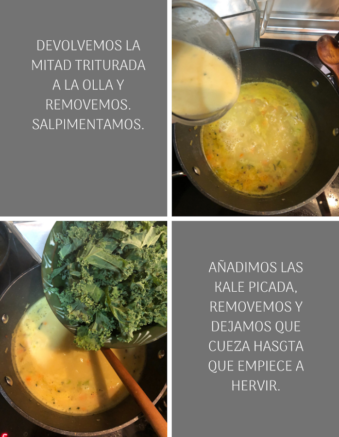 Añadimos la kale, removemos y dejamos que se cueza a fuego lento durante unos minutos más hasta que empiece a hervir de nuevo.