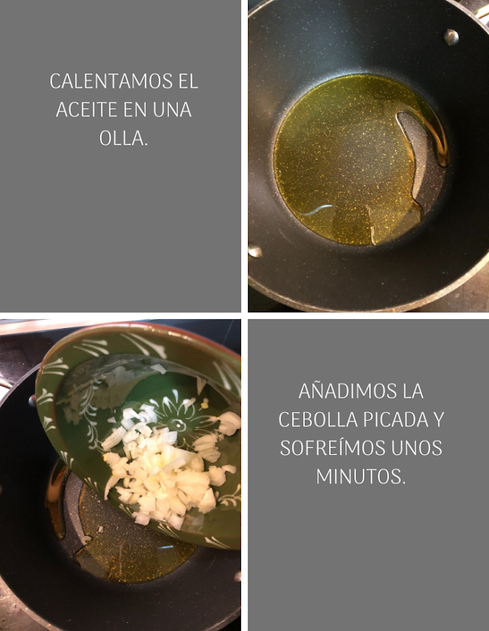 En una olla, ponemos el aceite a calentar y añadimos la cebolla. Removemos y dejamos que se ponga tierna cocinando a fuego medio-bajo durante unos minutos.