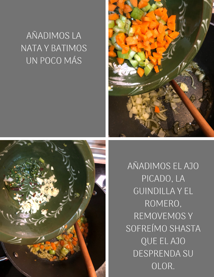 Echamos el ajo, la guindilla y el romero, removemos y dejamos que se cuezan hasta que el ajo empiece a soltar olor. Tener cuidado de que no se queme.