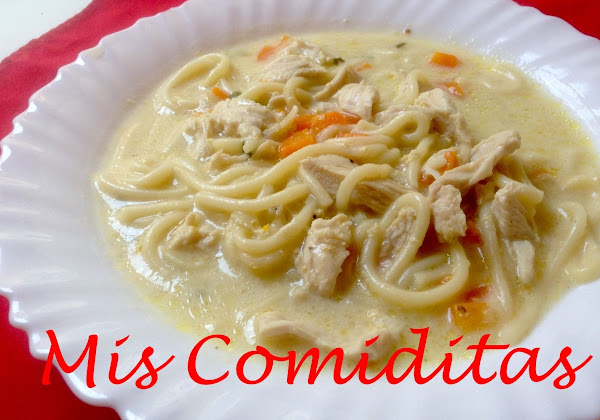 Sacar el pollo de la sopa y trocear toscamente, volver a introducirlo en la olla, añadir la pasta y una o dos cucharadas de bechamel. Dejar cocinar un par de minutos más. Añadir un chorreoncito de nata (crema de leche) para cocinar y apagar el fuego pasados un par de minutos.