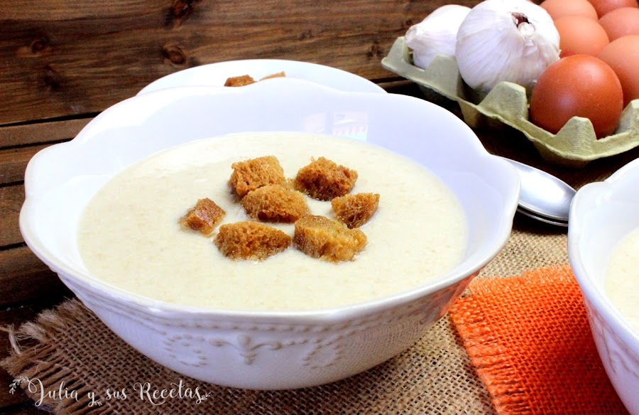 La sopa de hoy es una variedad de la sopa de ajo tradicional, pero mucho más suave y cremosa y que seguro os va a encantar, a vosotros y a vuestros invitados, pues es una sopa ideal para servir en cualquier ocasión.