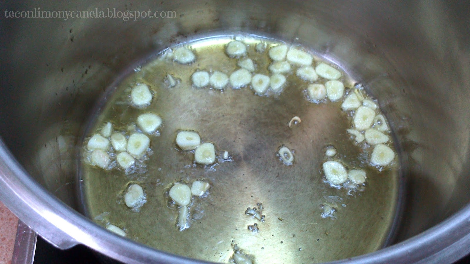Primero, pico los ajos, y los dejo dorar en la olla, en un fondo de aceite de oliva virgen extra. Remover de vez en cuando.