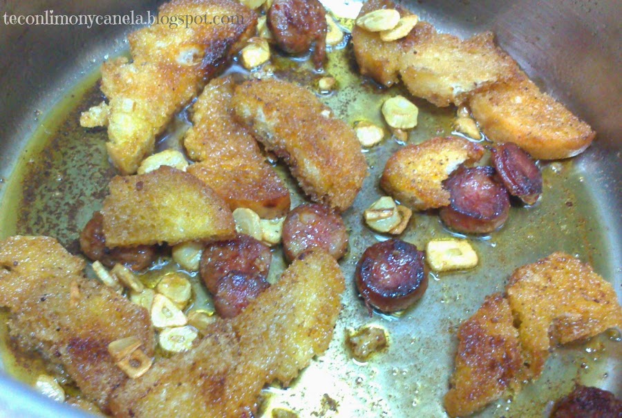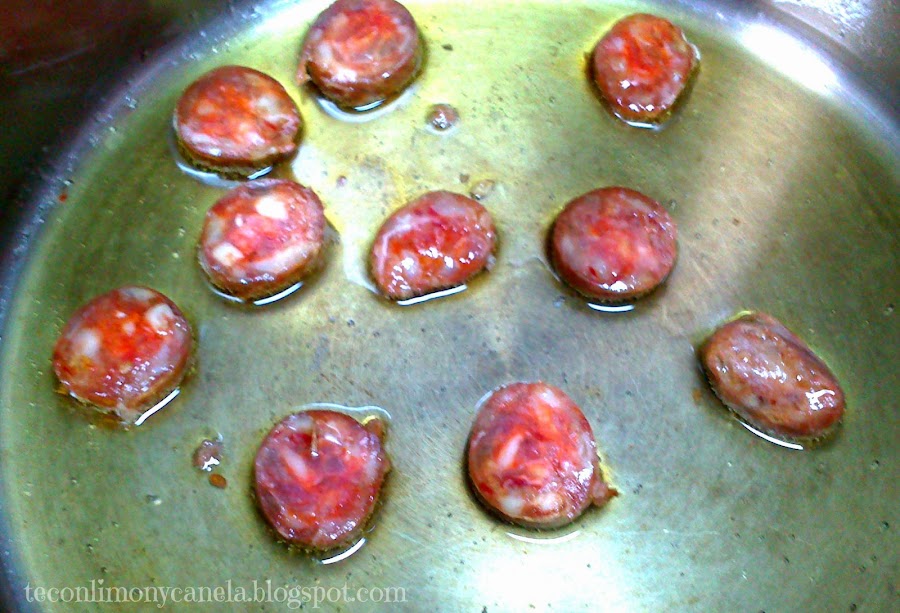 A continuación pongo en ese mismo aceite el chorizo, cortado en rodajitas.