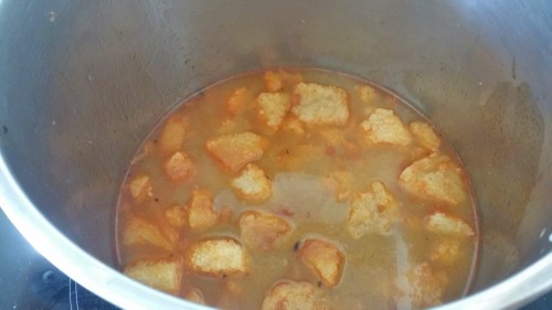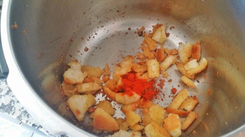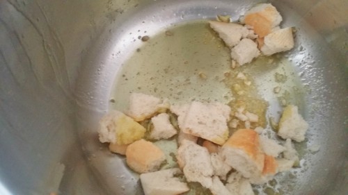 3- Ahora sube el fuego para que se ponga el aceite más caliente. Añade el pan que hemos cortado y remueve con una cuchara para que se impregne del aceite.