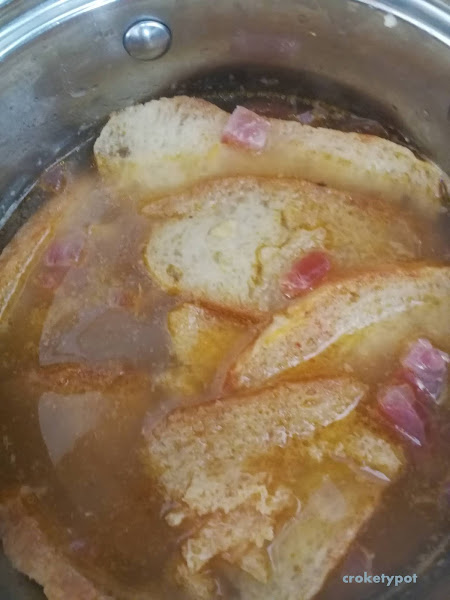 En la olla tendremos calentando el caldo de pollo Aneto, añadimos el jamón y el ajo, y se deja cocer 15 o 20 minutos, damos con el cucharón para desarmar el pan.