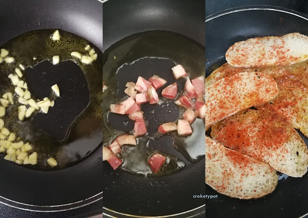 ELABORACIÓN: En una sartén ponemos un poco aceite de oliva AOVE, doramos unos ajos y los reservamos, añadimos unos tacos de jamón y los salteamos, se reservan, cortamos el pan en rodajas y lo salteamos en la sartén, para que fría un poco le añadimos el pimentón, le damos una vuelta y lo pasamos a una olla.