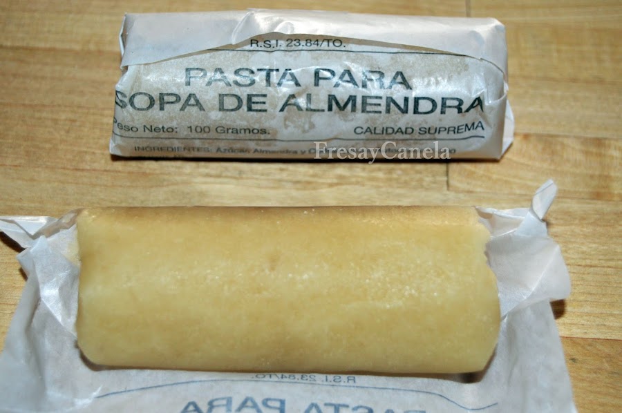 Yo he utilizado pasta para sopa de almendra en su elaboración, ahora ya va siendo más fácil encontrarla en supermercados, podría haberla preparado yo con almendras y azúcar, pero la de la confitería de mi pueblo es tan rica. Por si no os resulta fácil encontrar la citada pasta, lo único que tenéis que hacer es pelar la almendra con agua muy caliente y machacarla en la misma cantidad de azúcar hasta conseguir una pasta fina y uniforme.