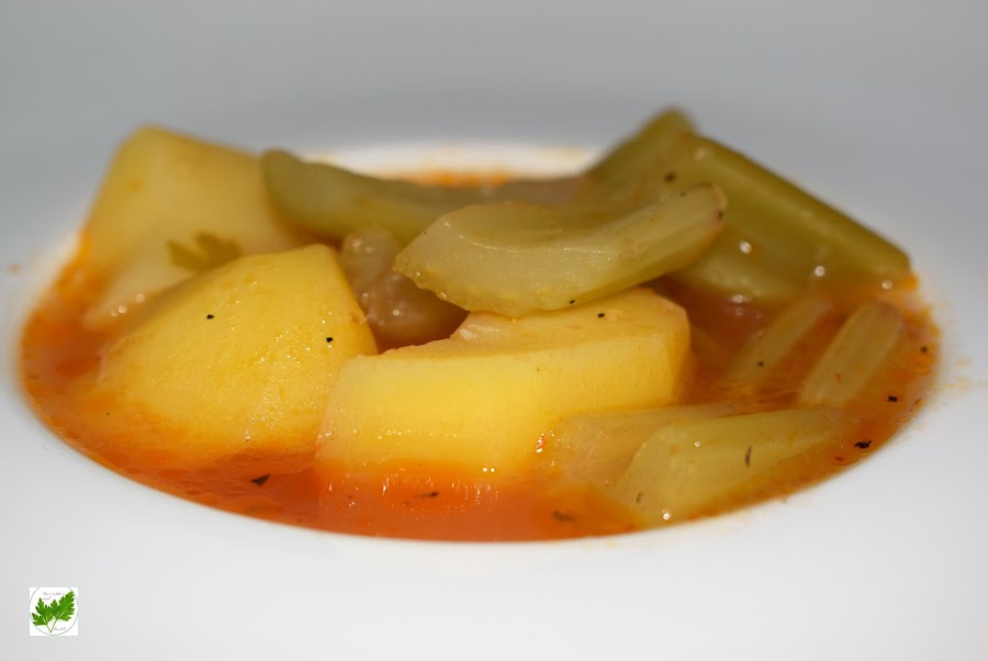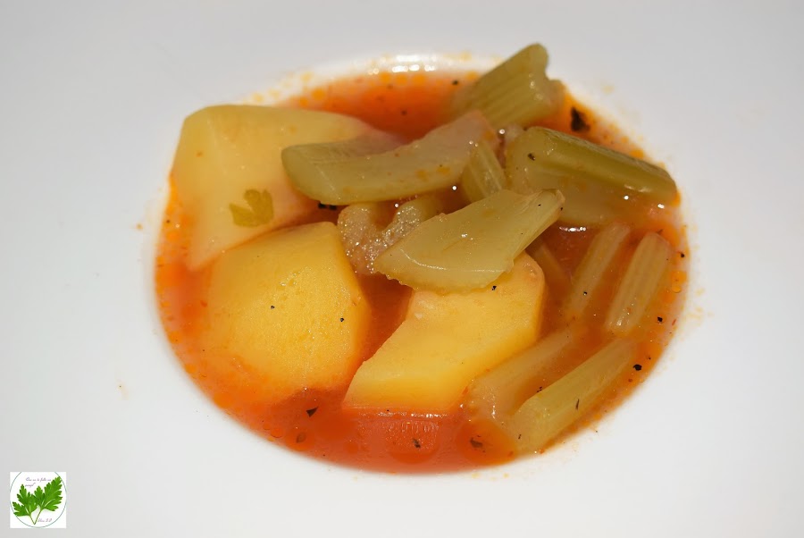 Pon a calentar el aceite en el fondo de una cacerola. Pela y pica los ajos y el perejil muy pequeñitos. Sofríe un par de minutos y en cuanto se empiecen a dorar los ajos añade el tomate. Rehoga todo junto unos minutos e incorpora el resto de ingredientes. Cuece a fuego medio durante 20 minutos hasta que las patatas y el apio estén tiernos.