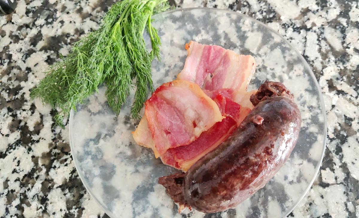 En una cazuela pon un poco de aceite y sofríe la morcilla y beicon troceado, retira y reserva.