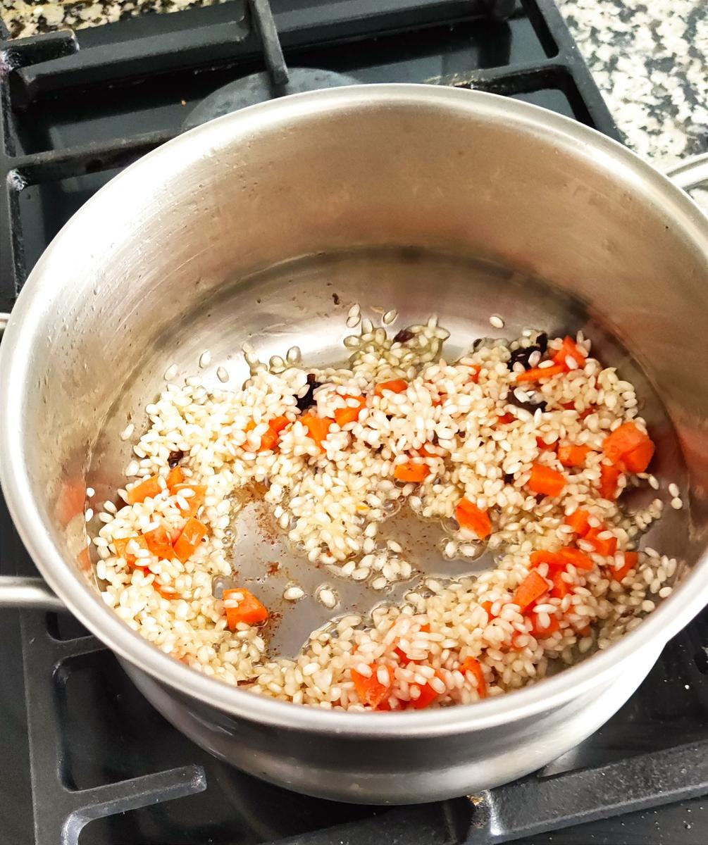 En el aceite que tenemos en la cazuela añade los 175 gr de arroz y la zanahoria limpia y cortada a trocitos. Sofreir un par de minutos e incorporar el agua bien caliente. Trocear el hinojo y añadir a la sopa.
