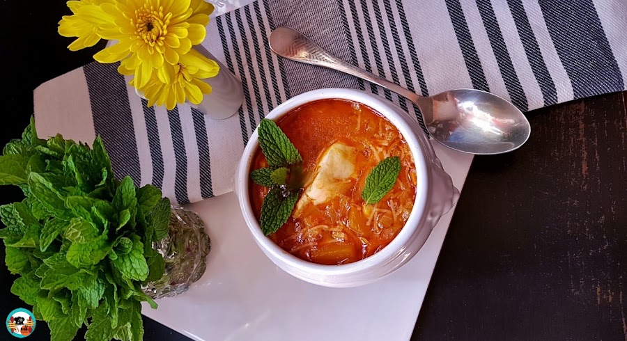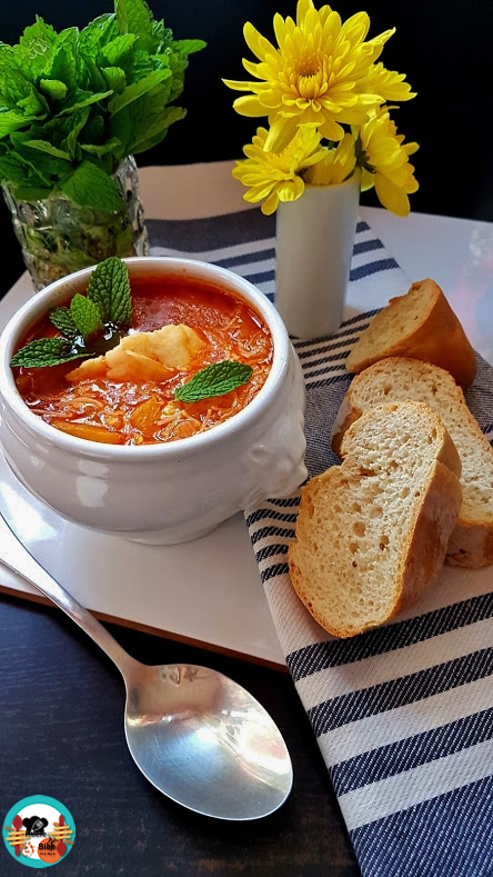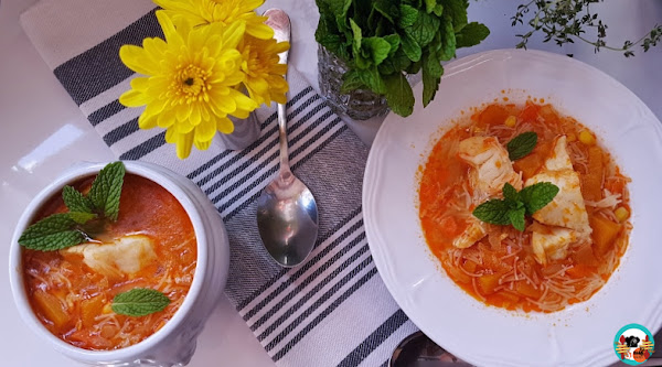 Agregamos el pimentón de la vera y lo mezclamos bien. Cubrimos las verduras con agua, dejamos que la sopa se cocine 20 minutos a fuego medio. Cortamos el lomo de bacalao en trozos medianos 6 o 7 trozos, lo incorporamos a la sopa. Añadimos los fideos finos y dejamos que la sopa se cocine 10 minutos más. Apagamos el fuego, dejamos que la sopa repose unos minutos y servimos con unas hojas de hierbabuena fresca,