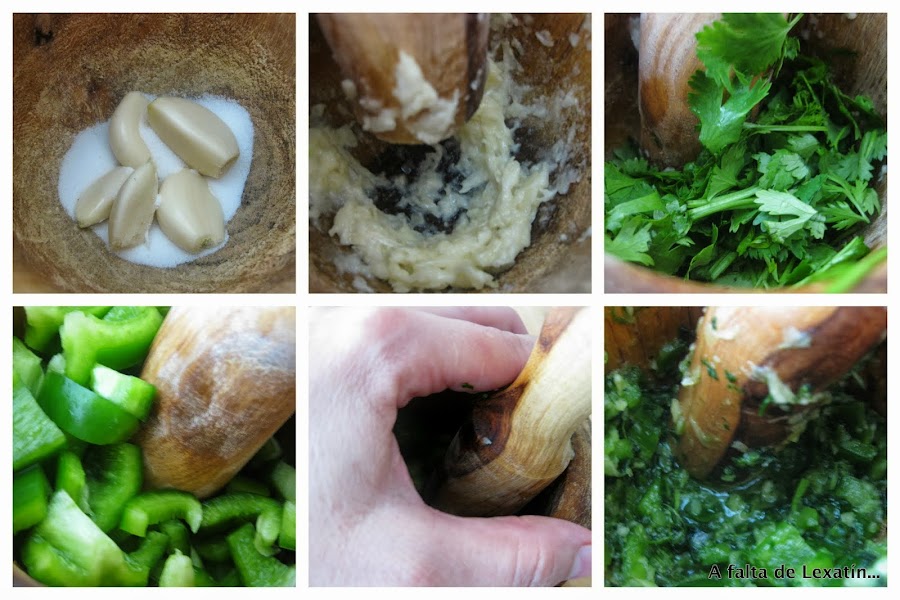 En un mortero machacamos los ajos con la sal, añadimos el cilantro y machacamos de nuevo, por último el pimiento verde en trocitos . Tapamos con la mano el mortero para no mancharnos con el jugo de los pimientos.