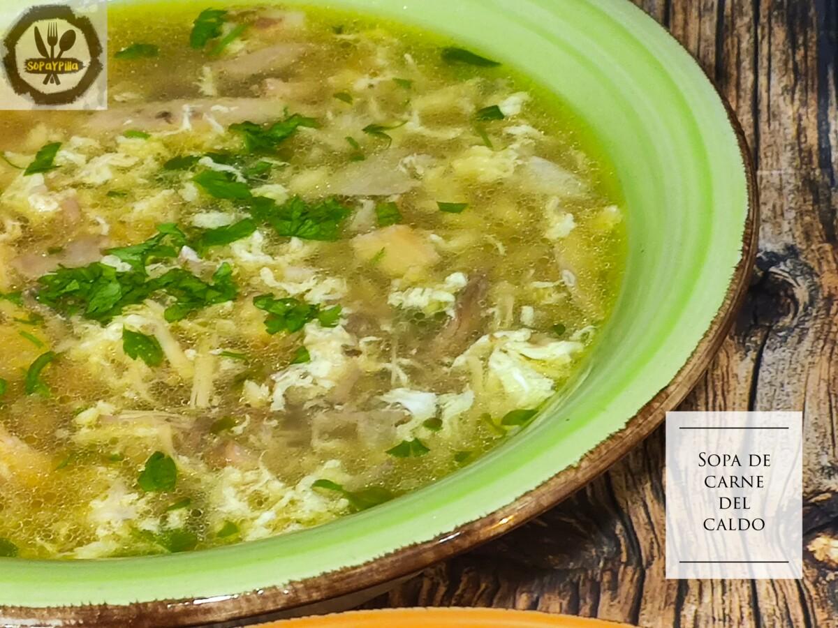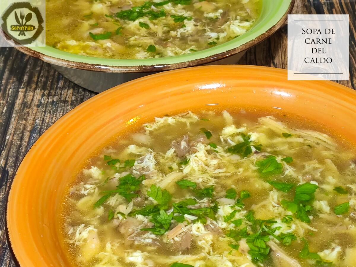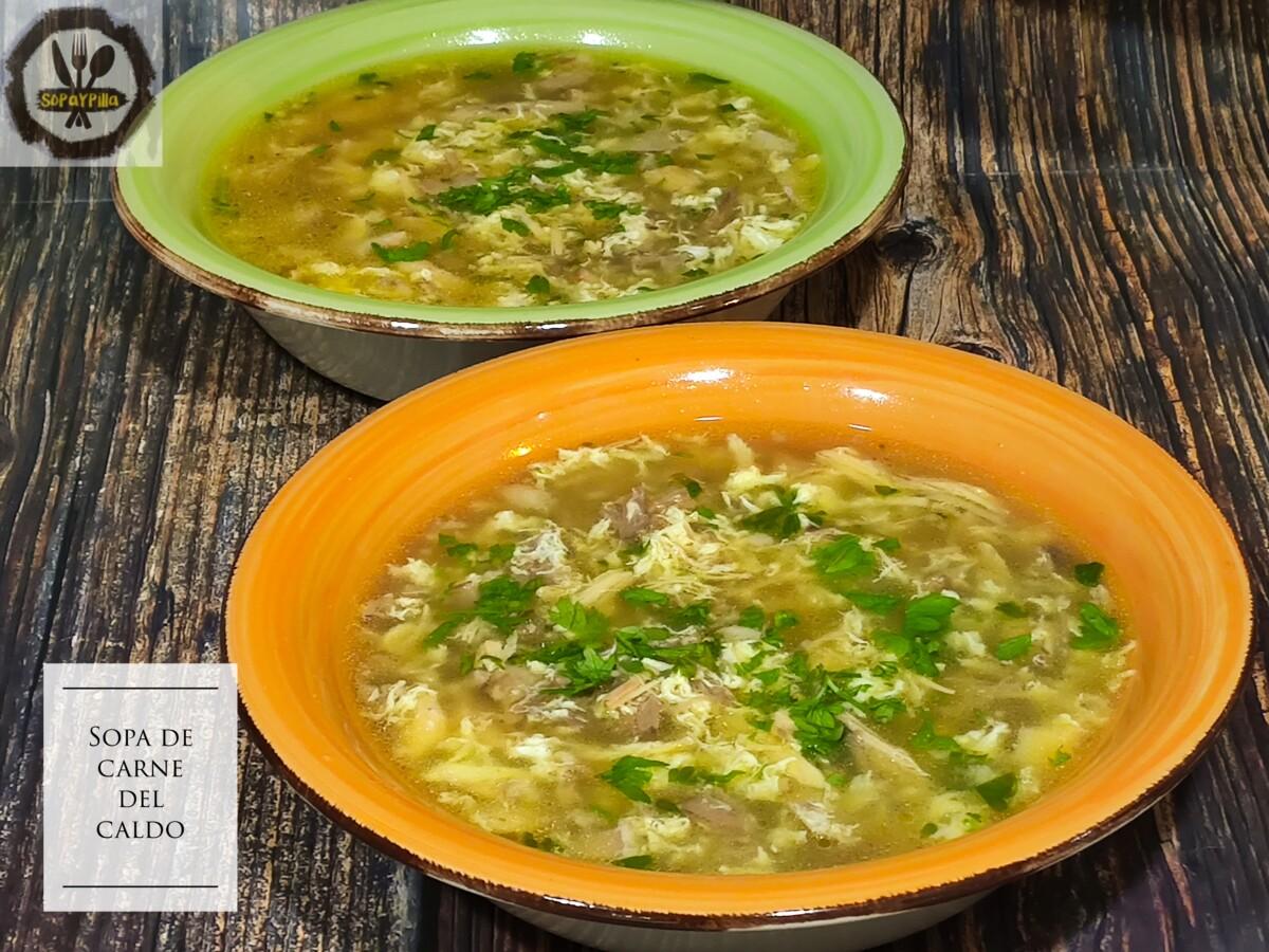 Ponemos el caldo en una olla a calentar y añadimos la carne del caldo, que ya habremos deshuesado y deshilado un poco (o troceado)