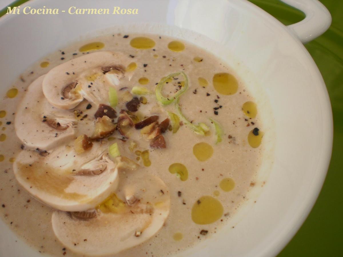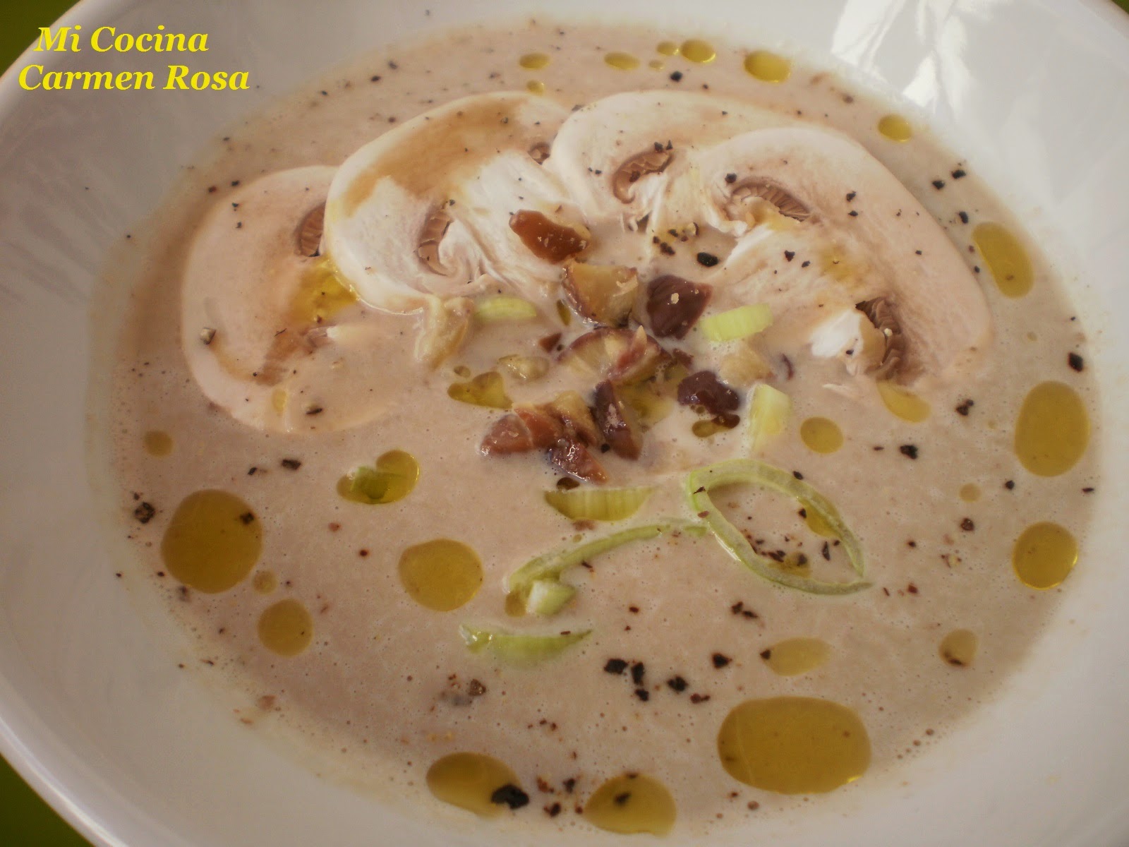 Echar la crema en un plato hondo, colocar los champiñones, los trozos de puerro verde y trocitos de castaña asada.