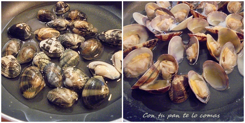 2. Una vez pasado el tiempo las sacamos (una por una para no remover el agua y que la arenilla se quede abajo) y las pondremos al fuego con una cucharada de aceite y un chorrito de vino blanco, hasta que se abran. No añadas sal.