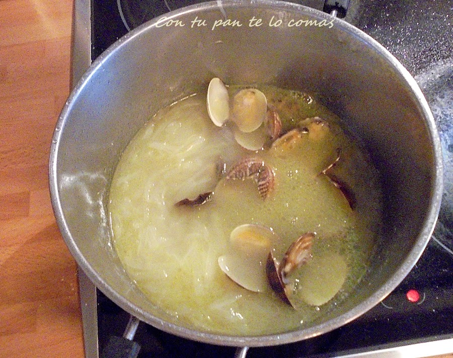 3. Reservamos el caldito y sacamos las almejas a un plato mientras se hace la sopa.