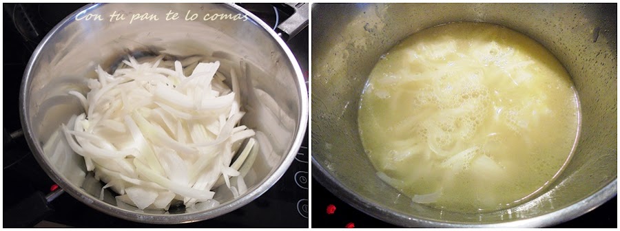 4. Pelamos y cortamos las cebollas en juliana y las pochamos en una cazuela con el resto del aceite de oliva, a fuego muy suave, durante 15 minutos y removiendo contínuamente hasta que veamos que la cebolla está blandita. Para ayudar a que sude la cebolla añadiremos una pizca de sal, pero sin pasarnos porque el caldo que añadiremos ya está salado.