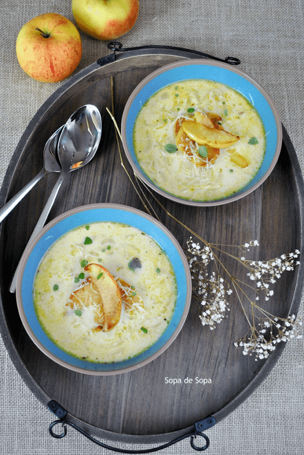 Como veis, traigo una sopa de cebolla si, pero cambiando el pan gratinado por unas manzanas salteadas. Os aseguro que esta sopa no tiene nada que envidiarle a la original. Y si no comprobarlo vosotros mismos.