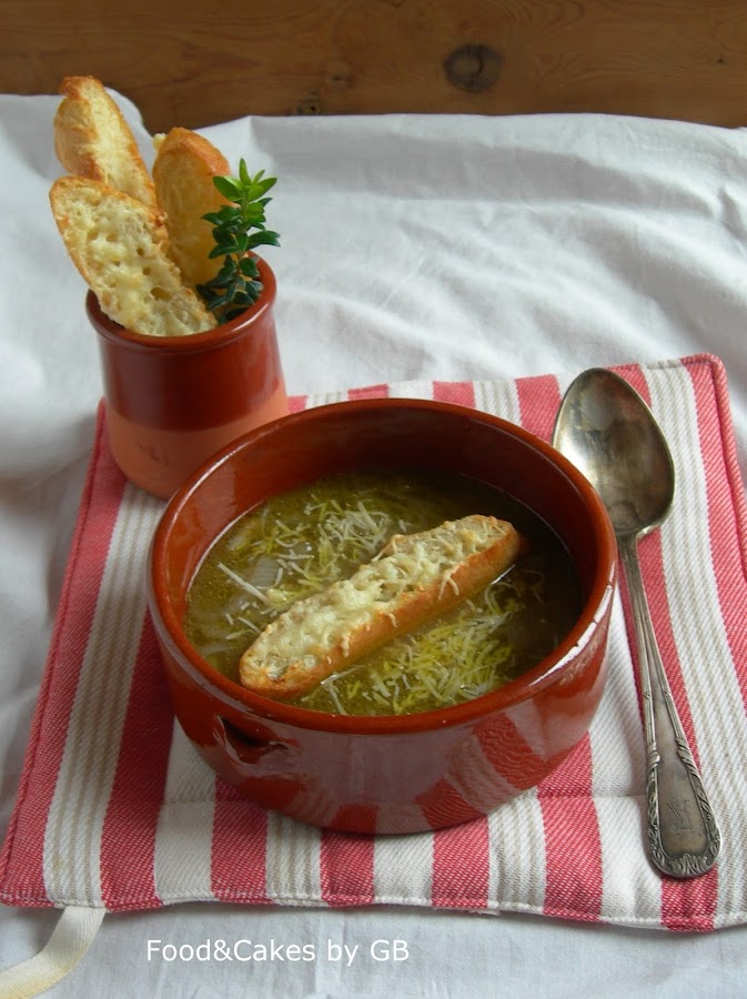 En esta ocasión en vez de gratinar el bol de la sopa con el queso le he puesto unas rebanadas de pan untadas con un poco de mantequilla y queso por encima para poder gratinar.