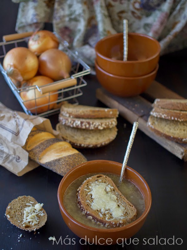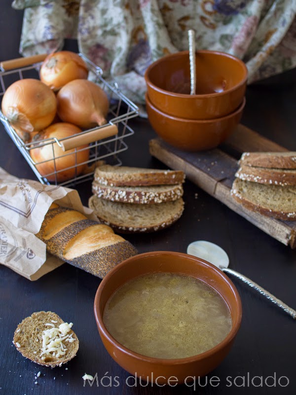 Sí os digo la verdad, en casa no somos muy soperos, las cosas como son. Somos más de tenedor que de cuchara, pero de vez en cuando cae alguna sopita rica y reconstituyente, como esta sopa de cebolla que he sacado de un libro que me auto regalé hace unos meses, El arte de la cocina francesa de Julia Child.