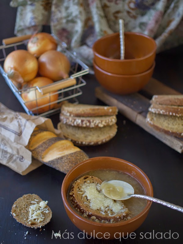 * Tostar el pan con el queso por encima para que se gratine y luego colocar sobre la sopa.