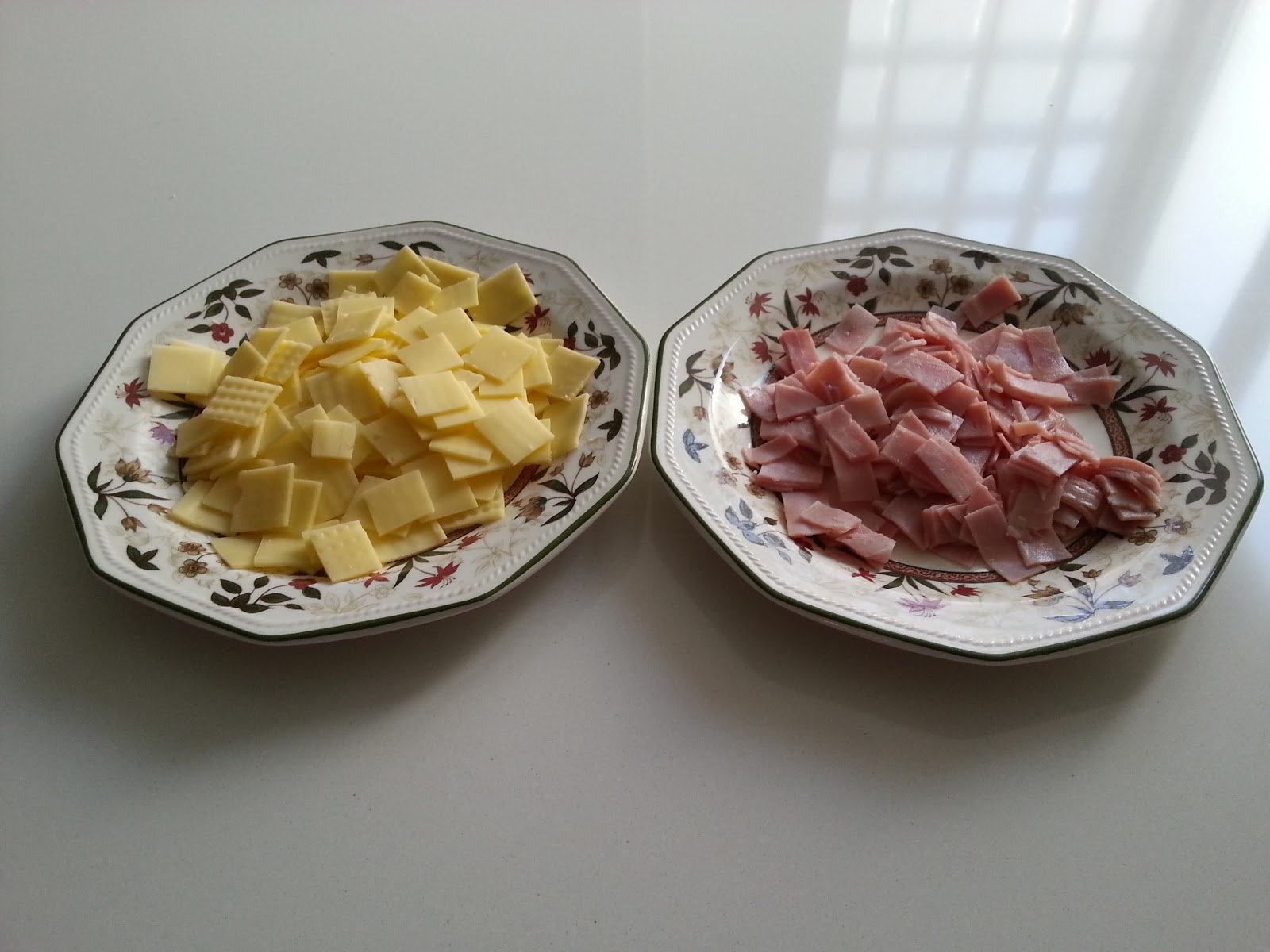 3. - El jamón y el queso lo vamos cortando en cuadritos. Yo pongo emmental, si os resulta demasiado fuerte su sabor, podéis usar otro más suave, pero el sabor del emmental, para mí, es fundamental.