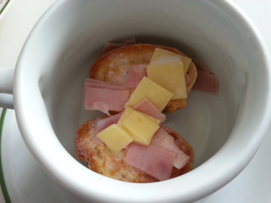 Ponemos rebanadas de pan, un poco de jamón y queso por encima, y un poco de leche.