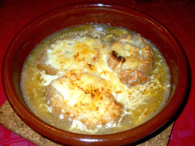 Cortar la baguette en rebanadas, colocar 2 o 3 croûtes (rebanadas) sobre la sopa y echar el queso rallado por encima para gratinar. Poner el grill caliente hasta que el queso se haya derretido y dorado..