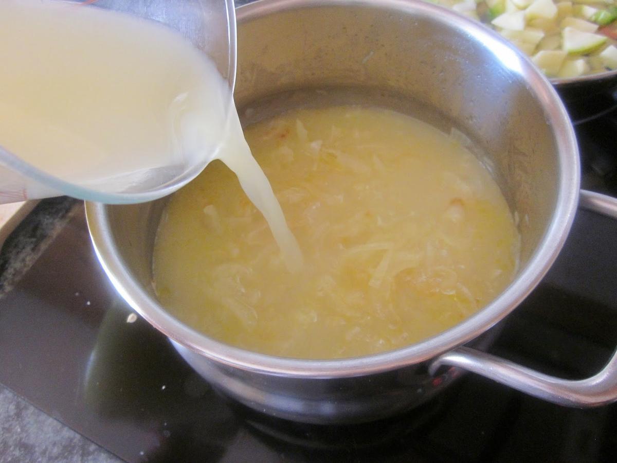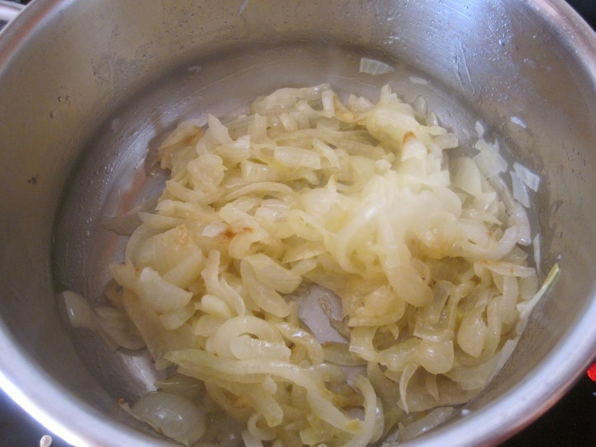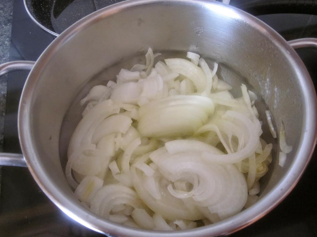 Mientras se derrite ,cortamos las cebollas en juliana, añadimos a la olla, damos unas vueltas y tapamos la olla para que sude, dejamos hacer a fuego lento.